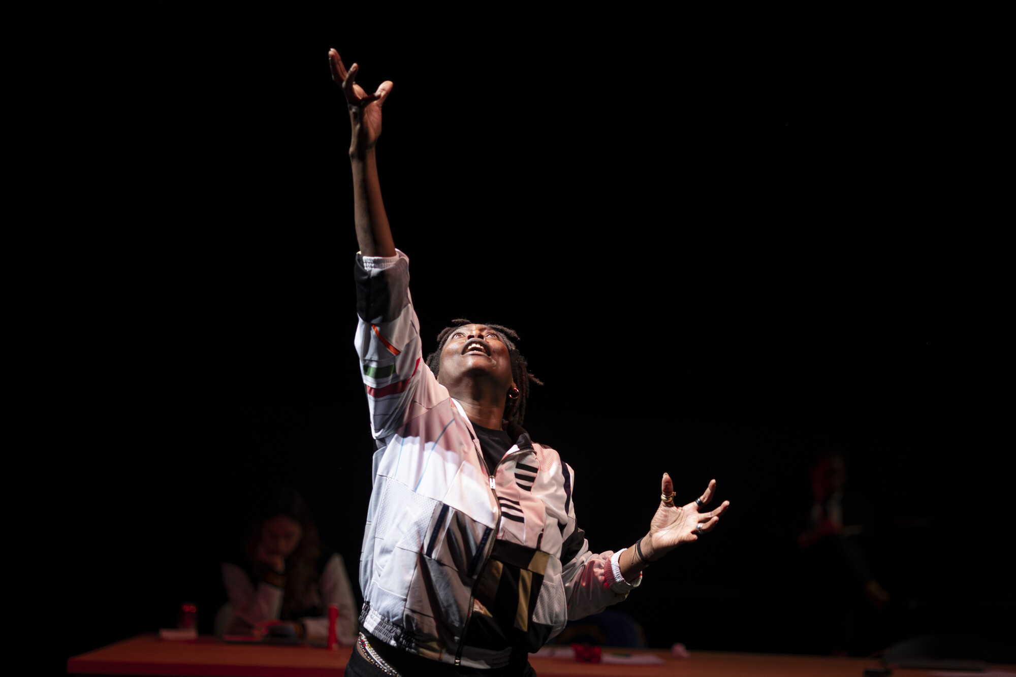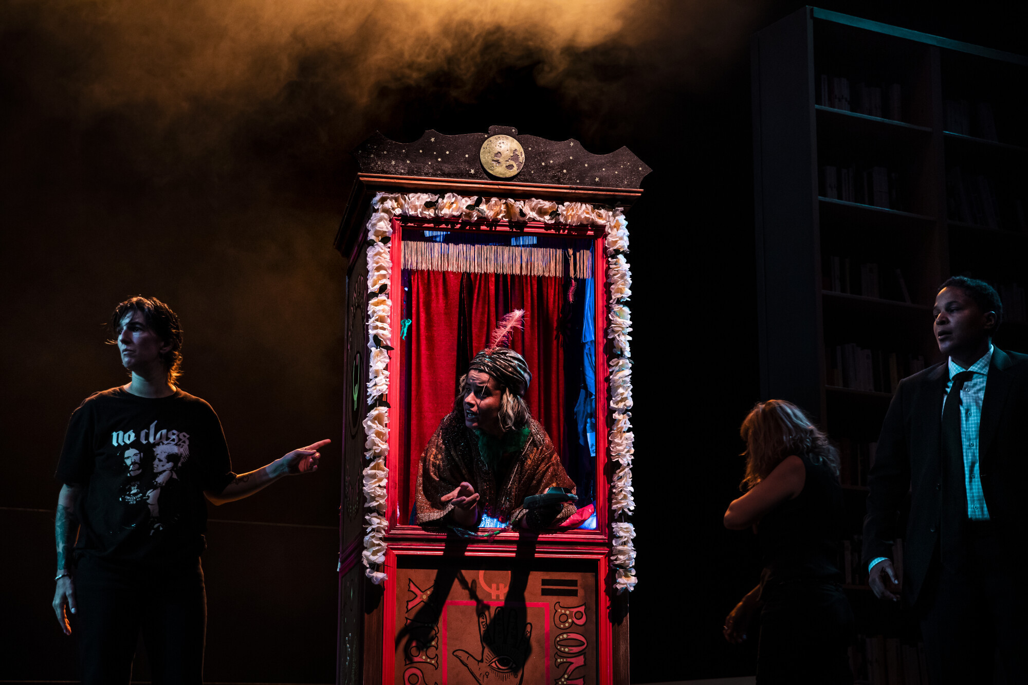 Les écrivain·es décident de mettre en scène quatre auteur·ices dans une situation miroir, qui cherchent leurs mots dans cette sensation d’asphyxie, s’allient et convoquent sur scène des personnages qui sont à la fois des doubles fictionnels, des avatars, des muses et des démons : une multitude hirsute, tendre et menaçante, comme un peuple qui manque, une insurrection qui vient.
