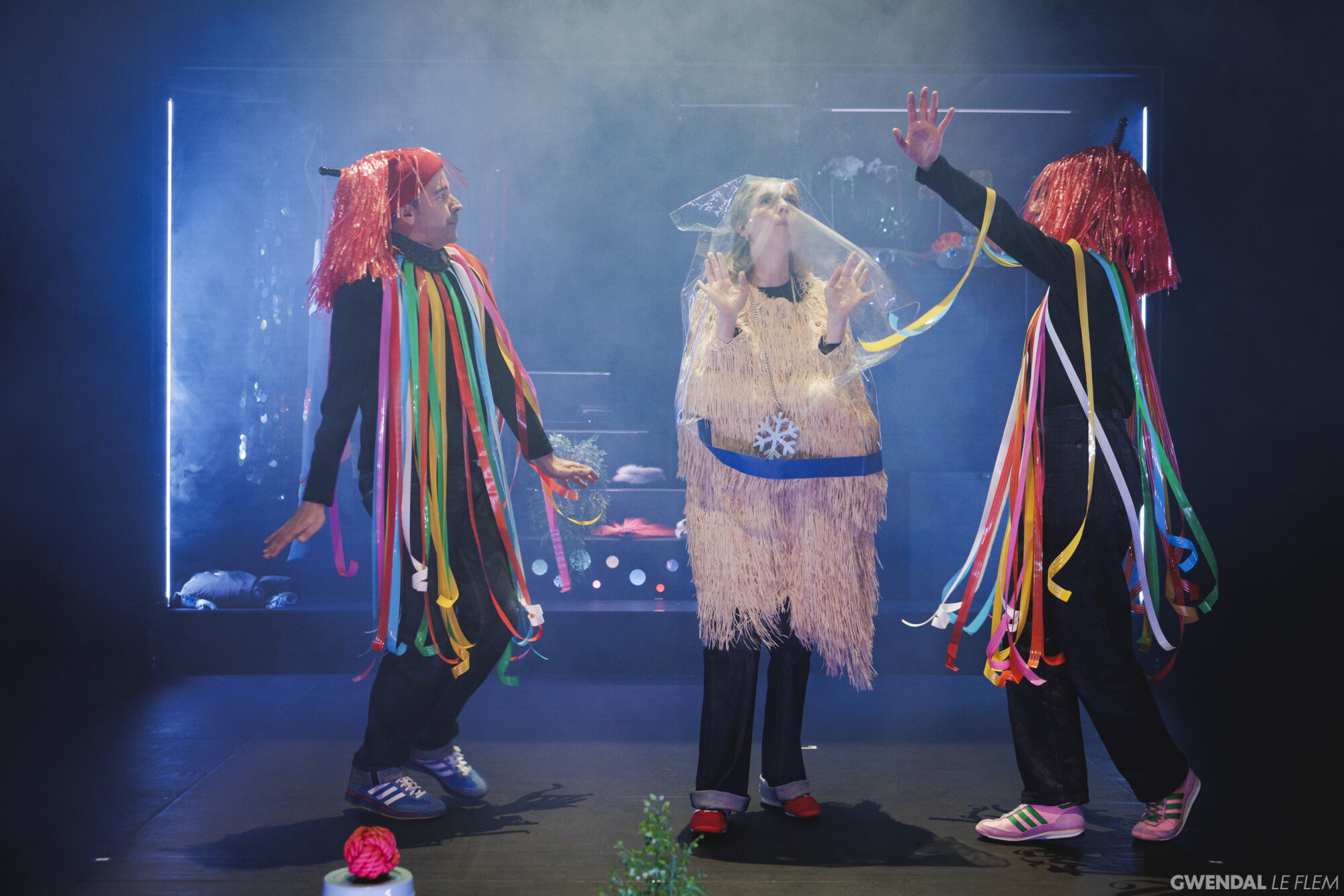 Comment leur dire adieu ? La puissance de l'enfance, c'est l'imagination au pouvoir. Avec beaucoup d'humour et de poésie, des cérémonies s'organisent, des processions et des rituels dans lesquels on chante, on danse, on ramasse des petits cailloux ou des fleurs pour accompagner le grand départ. Les 3 ami·es nous plongent dans un univers onirique où les costumes et accessoires, fabriqués à partir de matériaux d’emballages et d’éléments naturels, transforment la scène en un espace vivant et coloré. La perte de la boule de poils, de plumes ou d'écailles, se transforme en aventure. Une traversée pleine de tendresse qui invite à voir à hauteur d'enfant la question du deuil.